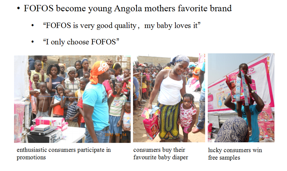 After three years development,FOFOS has become the No.1 baby diaper brand in high-end and middle-end Angola market. It performs well in every aspects such as popularity, market share, purchase rate and reputation.